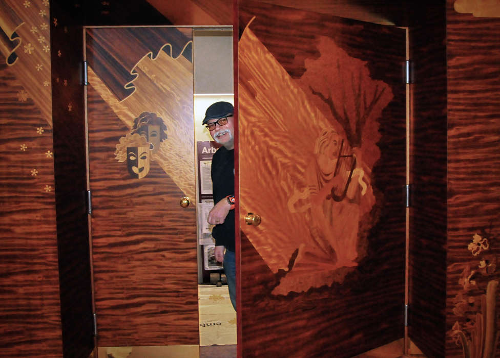 Intarsiadörrar tillverkade på Mjölby intarsia en gång i tiden har varsamt restaurerats av snickeriet Storsjö trapp. Foto: Elin Elderud