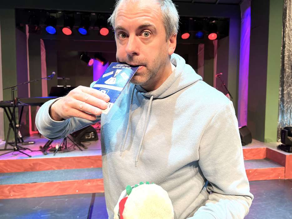Andreas "Ea" Johansson berättar att lokalrevyn biter tag i frågan om parkeringsskivor och hamburgare i Motala. Foto: Sara Anderberg