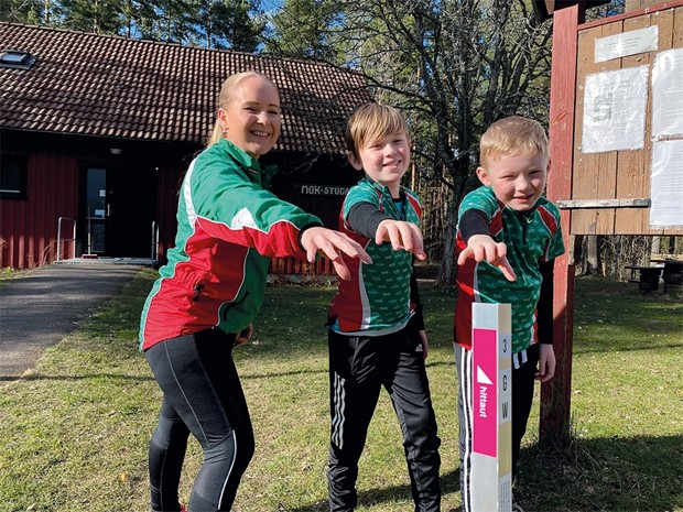 Lina Petersson i Mjölby orienteringsklubb. Klubben arrangerar "Hitta ut" som är en aktivitet där man ska leta checkpoints. Det kan man göra tillsammans, exempelvis med sina barn. Här är hon med sina två söner Elliot och Olle. Foto: Privat